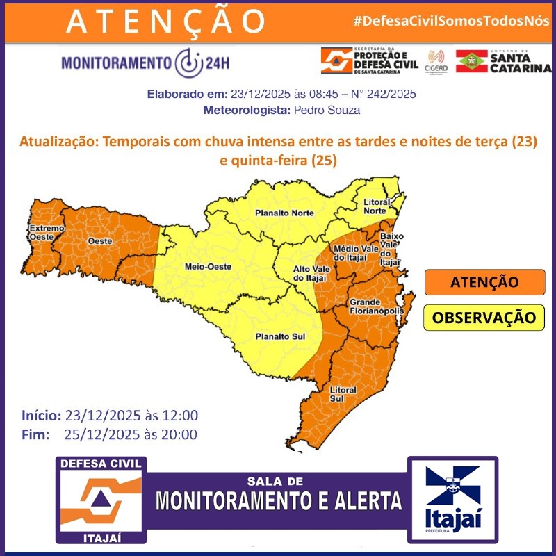 A Defesa Civil de Itajaí recomenda que a população acompanhe os boletins, avisos e alertas meteorológicos disponíveis no site defesacivil.itajai.sc.gov.br e nas redes sociais oficiais.
