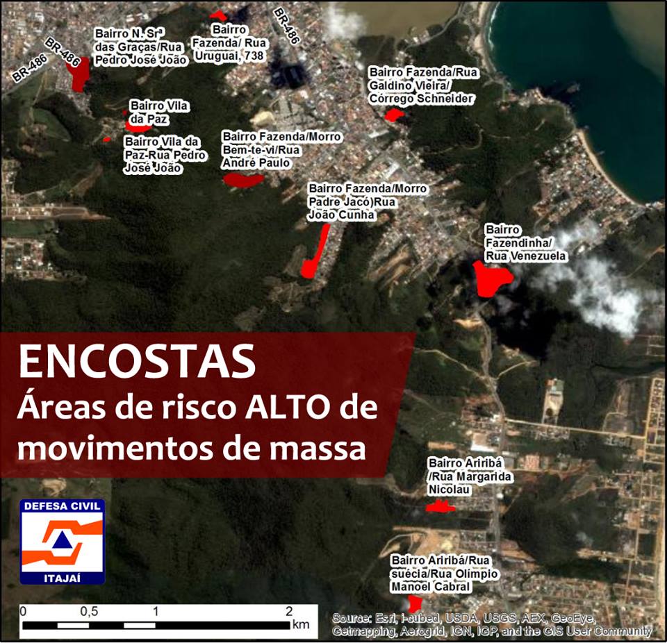 O alto volume de chuva ocorrido nas últimas 24h em Itajaí já ultrapassa 90 mm, o que já fica próximo da média climatológica para o mês de Janeiro no município. Esta condição de chuva persistente trouxe também o risco de deslizamentos, conforme o índice calculado pela plataforma Agroconnect da Epagri/Ciram. Na imagem abaixo, é possível identificar os pontos monitorados em Itajaí que apresentam risco de deslizamento em decorrência da chuva registrada nas últimas horas.
