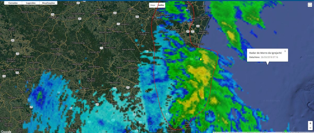 26/03/2018 08:26No fim de semana passou uma frente fria que trouxe chuva para a região de forma irregular. Choveu 67 mm em Balneário Camboriú, 70 mm em Camboriú, 55 mm em Itapema e 44 mm em Itajaí, no bairro Itaipava. Essa frente já está na altura de São Paulo, mas deixou áreas de instabilidade entre o planalto e o litoral. Para os próximos dias estaremos sob a influência da circulação marítima, e algumas áreas de instabilidade vindas do interior. Toda essa situação deixará uma semana chuvosa. Observe a imagem do radar muita nebulosidade sobre o litoral.