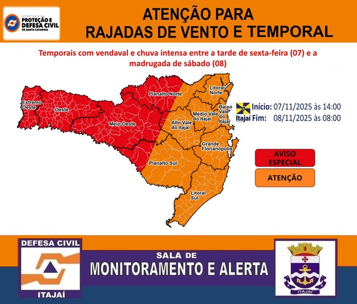 A Defesa Civil de Itajaí recomenda que a população acompanhe os boletins, avisos e alertas meteorológicos disponíveis no site https://defesacivil.itajai.sc.gov.br/ e nas redes sociais oficiais.