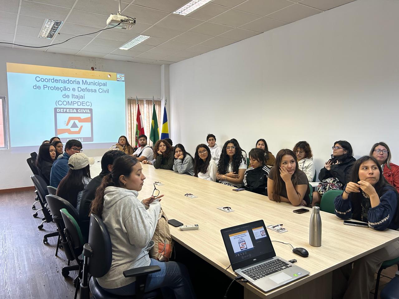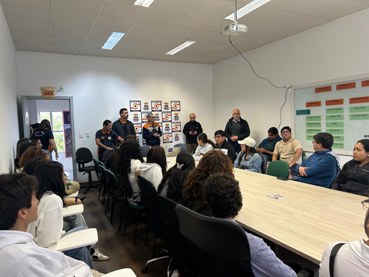 A Defesa Civil de Itajaí recebeu, nesta terça feira (24), um grupo de cerca de 30 estudantes de graduação e do Mestrado em Mudanças Climáticas da Universidade Científica del Sur, do Peru. A visita integra um intercâmbio de conhecimento organizado pela Universidade do Vale do Itajaí (Univali), por meio do Programa de Pós-Graduação em Ciência e Tecnologia Ambiental (PPGCTA).